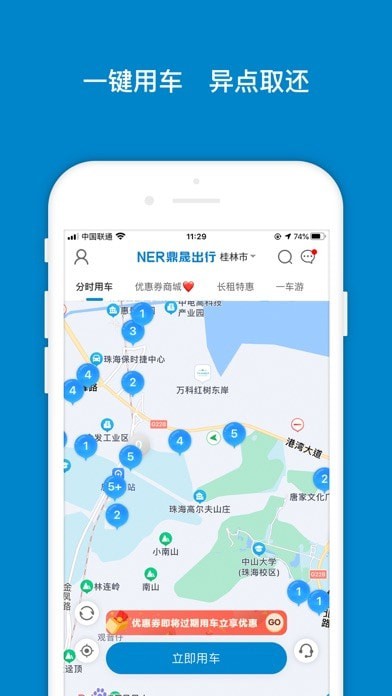2、【分时共享】分时租赁,共享车源,异点租还,畅享出行新体验。