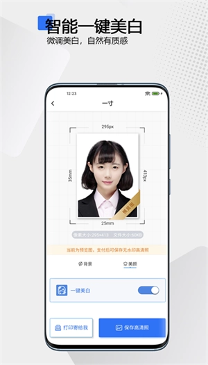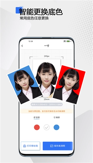 根据背景颜色一键更换证件,随意更换白底蓝底红底,专业算法识别面部轮廓,智能美白面部。