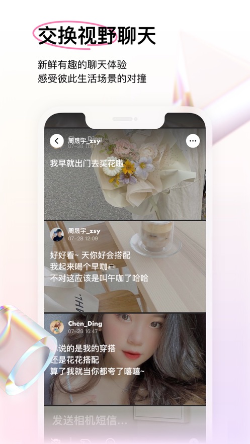 3、全新的聊天体验,与好友聊天的同时,时刻分享眼前,感受彼此生活场景的对撞。