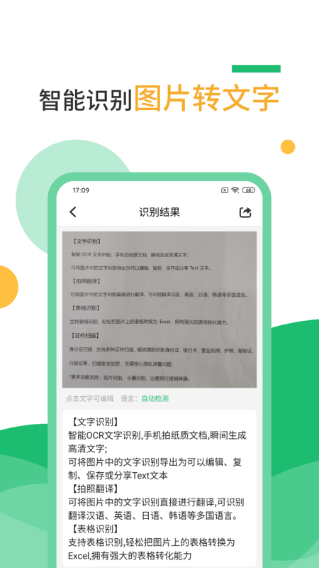 智能OCR快速识别,将图片中的文字识别导出为能够编辑、复制、保存或分享Text文本