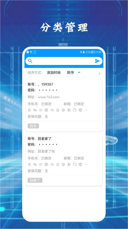 3、可以加密保护各位的账号和隐私,让你将所有的账号都记录下来,简单好用。