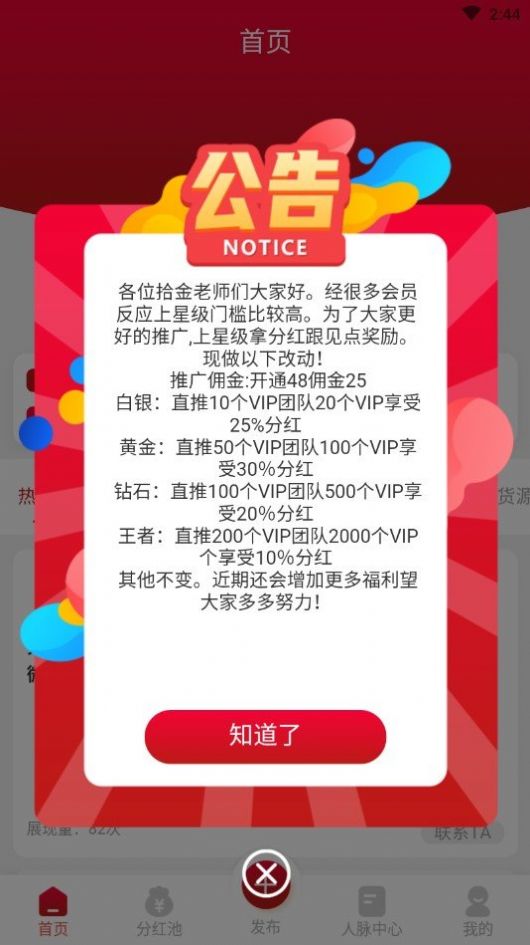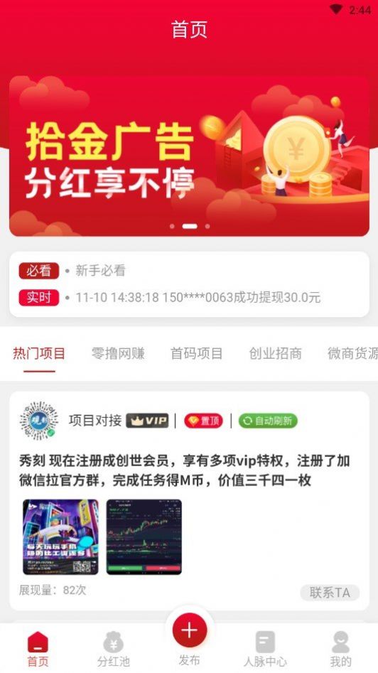 拾金广告app是一款分红模式的人脉赚钱平台,也可以通过软件了解行业的去向。