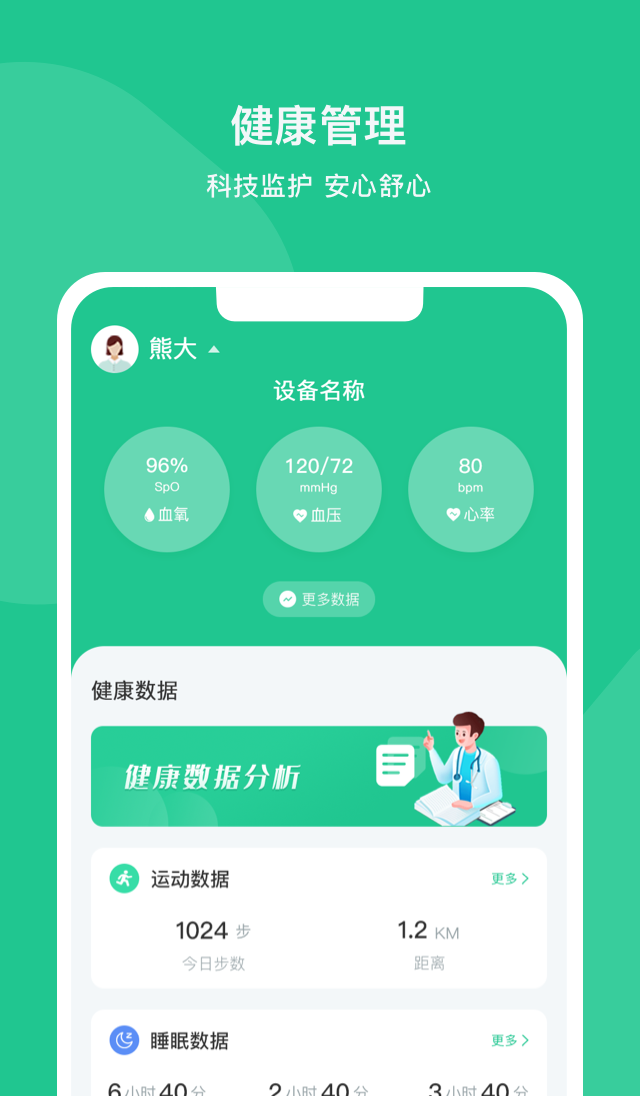 1、实时血压、体重、血糖、心率追踪功能,根据数据分析调整个性化健康方案;