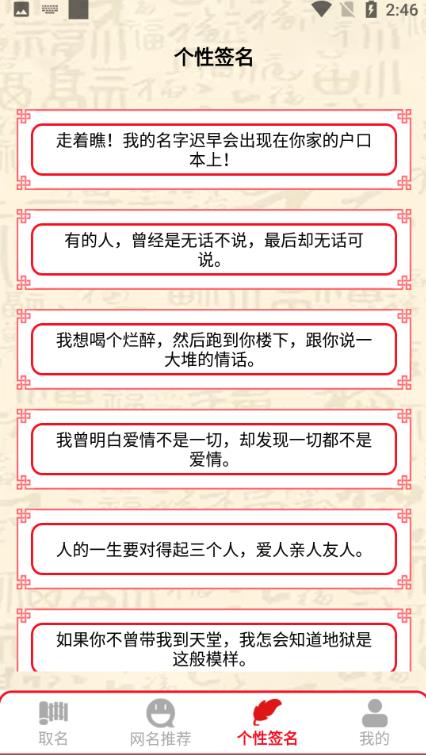 取名帮你来是一款好用的命名软件。您是否经常担心没有一个好的网络名称和个人签名?来到这里可以解决你的问题,并为你提供海量的网络名称和个性化的签名推荐。你可以自由选择,你可以找到你最喜欢的名字并使用它。你可以继续使用它,速速下载吧~