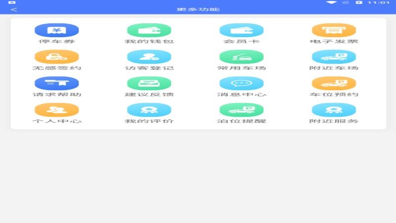 2、我的账单、消息中心、电子发票、访客登记、停车券、附近车场、建议反馈、请求帮助;