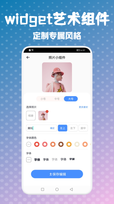 widget艺术小组件是一款不错的手机桌面小组件APP,这里拥有超丰富的艺术风格下爱哦组件,而且各种图片素材、编辑工具等非常的全面,大家可以自由来定制自己的专属桌面风格,无论是图片、颜色还是字体等等都可以轻松的来自定义,可以很好的满足大家对艺术的追求,轻松设置专属桌面,快来下载吧~