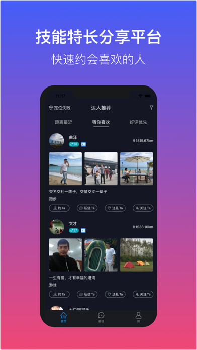 4.用户可以选择自己心仪的达人一起吃饭、看电影、跑步、健身、游戏等。