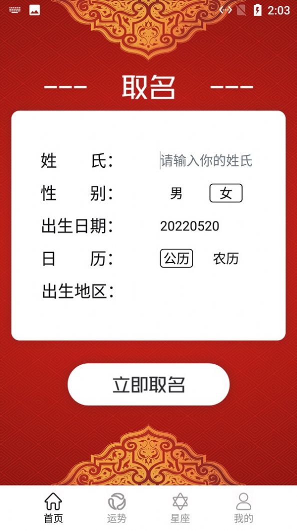 1、根据用户的姓氏,性别,出生日期,地区一键取名,方便操作;