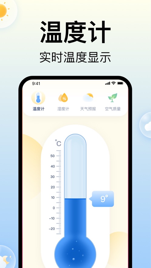 1.本软件精简了其他不必需要用到的功能,只保留实时温度显示,让你随时掌握周边温度情况。