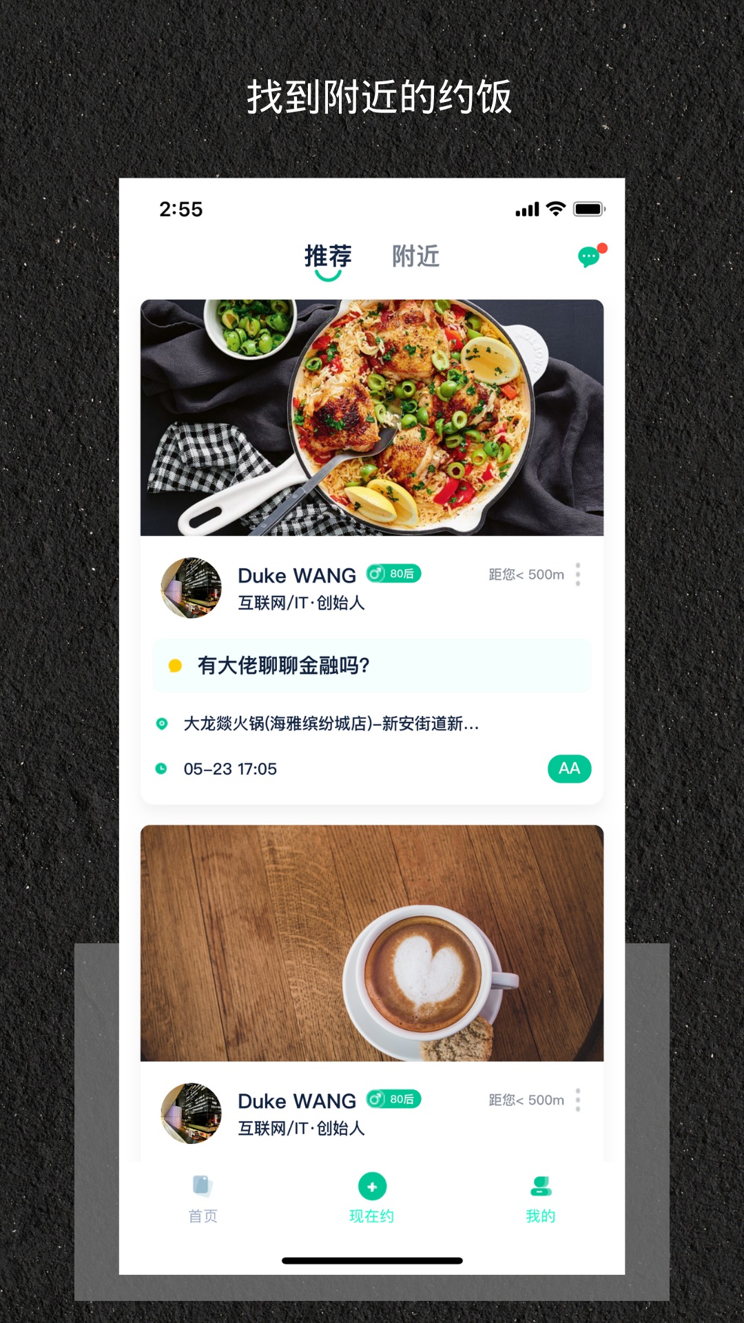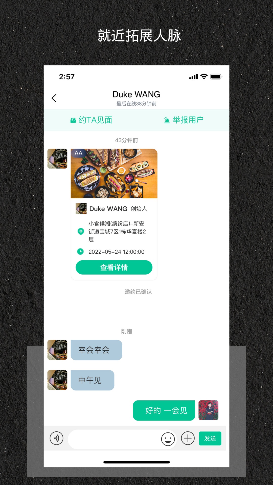 2.附近职场人找到附近的职场人发私邀,同时还能够根据用户饮食口味和话题兴趣相关推荐就近的职场约饭。