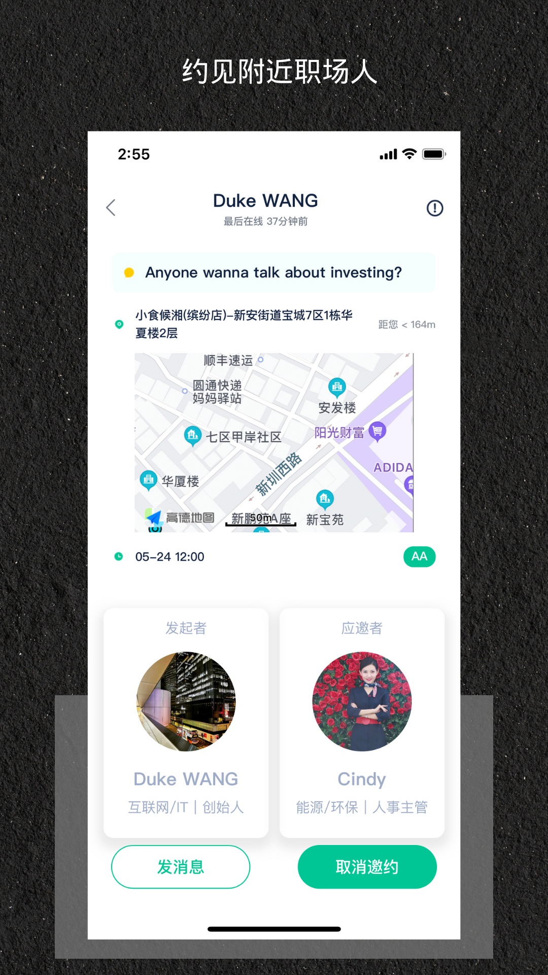 3.可以通过平台轻松的约见感兴趣的职场精英和行业大佬,在平台可以发布或者查看邀约非常便捷实用体验。