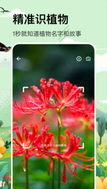 1. 用户通过将照片插入软件中的植物数据库,识别花草树木等植物。