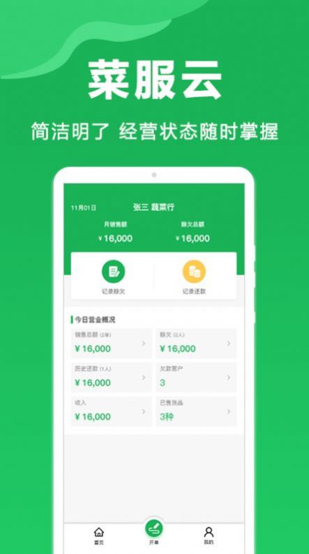 2.帮助商户高效完成开单,收银记账赊账管理功能,菜服云致力于让农批生意管理更简单更高效。