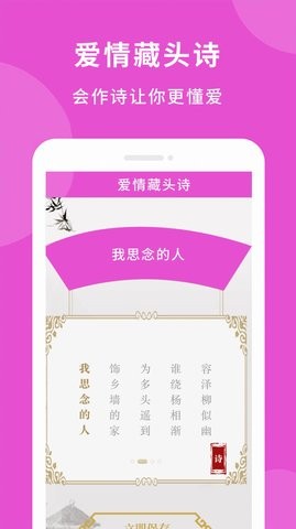 爱情藏头诗它是一个推送各种对话技巧和许多聊天脚本的应用程序。软件集合了各种实用的爱情话术。用户可以随意复制粘贴,每天可以选择不同的话术,帮助你打开撩妹的正确方式,让我们在线与他人的聊天不在无趣,感兴趣的朋友,快来本站下载体验吧!