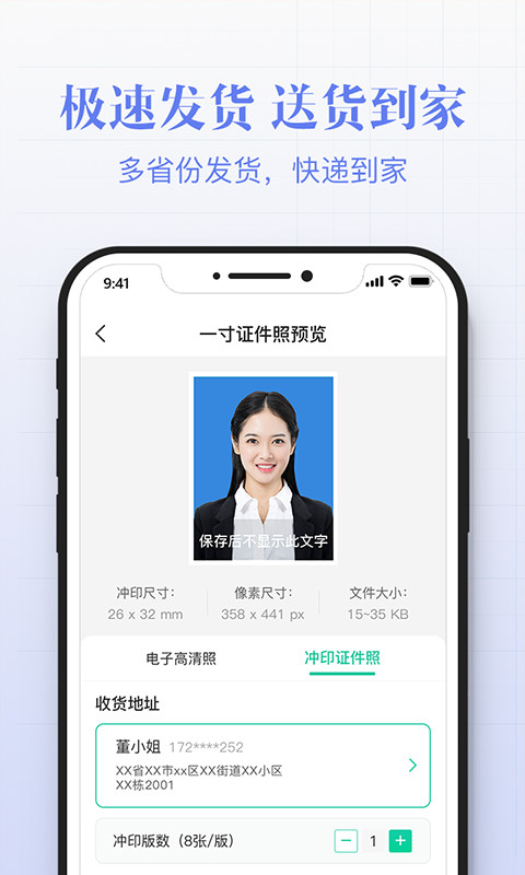 3、我们为了方便您的体验更好,新增了照片打印功能,一键即可打印,支持在线下单+证件复印冲印,快递到家,让您足不出户即可获得完美证件照!