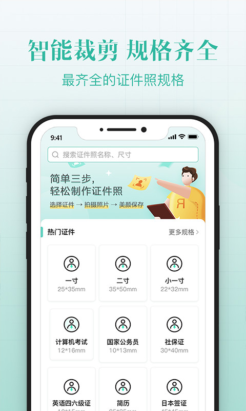 支持多种尺寸的证件照制作,包括一寸证件照、二寸证件照、身份证照片、学生证照片、学籍登记照、四六级报名照、计算机等级考试照、美国签证照片、日本签证照片、教师资格证等多种规格照片,宝宝证件照、学生证件照、工作证件照、护照签证照在家就能制作。