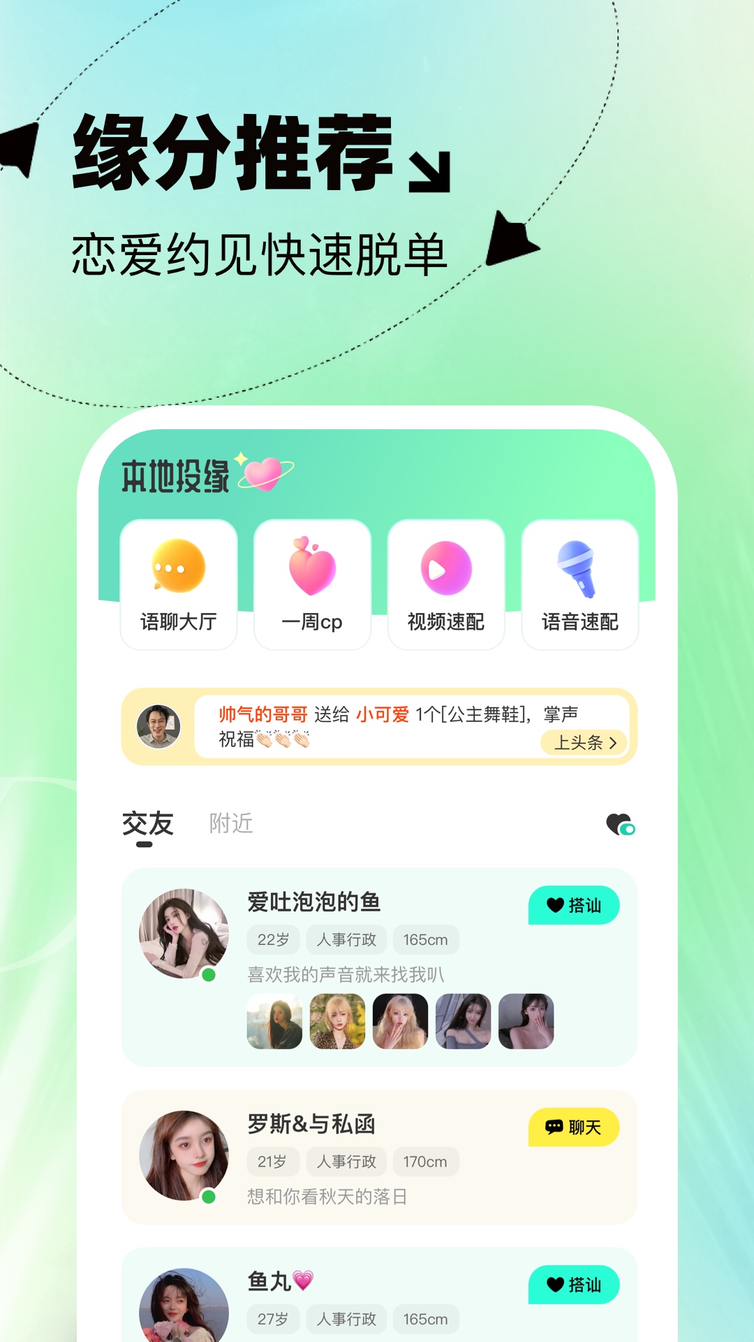 本地投缘这是一款专门为广大单身人士打造的手机交友信息平台,这里可以进行各种在线聊天,如果两个人有缘的话还可以进行线下约会拉近两个人的感情,用户在这里可以进行各种不同交友模式的选择。众多模式完全可以满足用户的需求,用户完全不用担心找不到朋友。