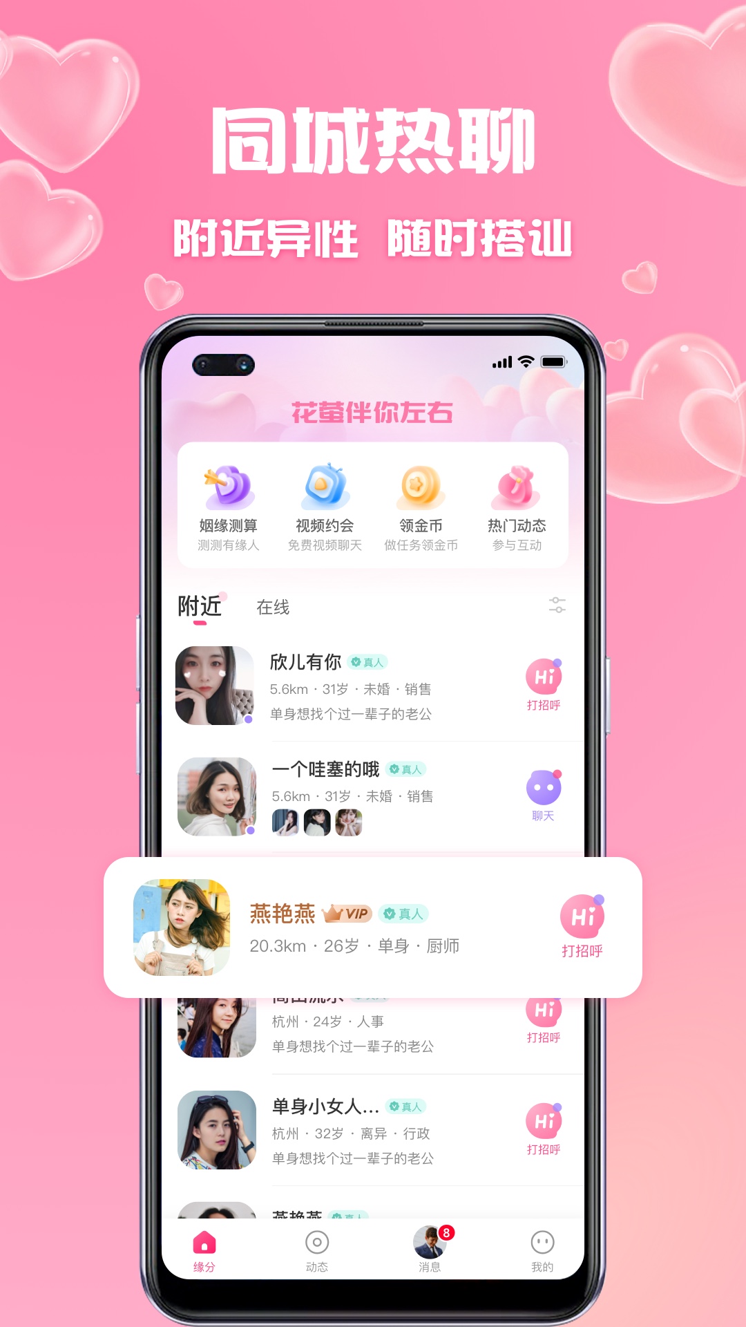 花萤这是一款免费的手机同城互动app,用户可以在这里认识更多新的朋友,这里有着非常强大的手机定位功能,用户可以开启附近的人,查找自己附近的异性进行搭讪,可以帮助用户进行快速的脱单,这里所有的用户都是有着非常详细的信息的,都是真实可靠的。