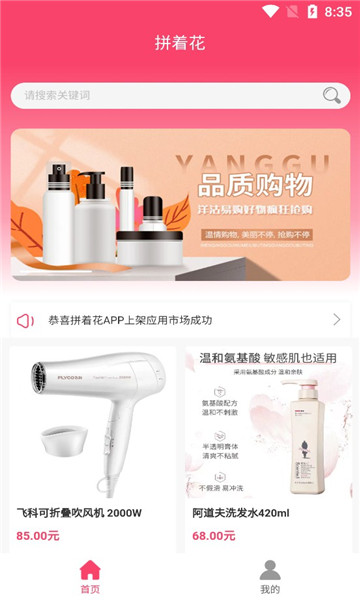 拼着花这是一款可以进行在线团购的手机商城,在这里用户可以进行各种商品的在线团购,可以帮助用户节省很多的生活消费开支,并且这里所有的商品全部都是高品质的,用户可以在线查看相关的信息进行了解,并且这里还有9.9包邮专区的可以进行选购,用户可以根据自己的需求进行购物。
