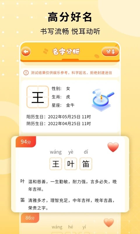 2、帮助孩子取到一个吉祥寓意好的名字,对名字进行了分析。