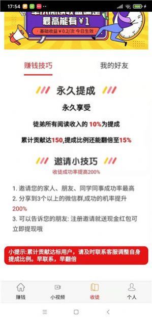 2.收徒可享受所有徒弟10%提成收益,当累计收益满150元还能翻倍至15%提成。