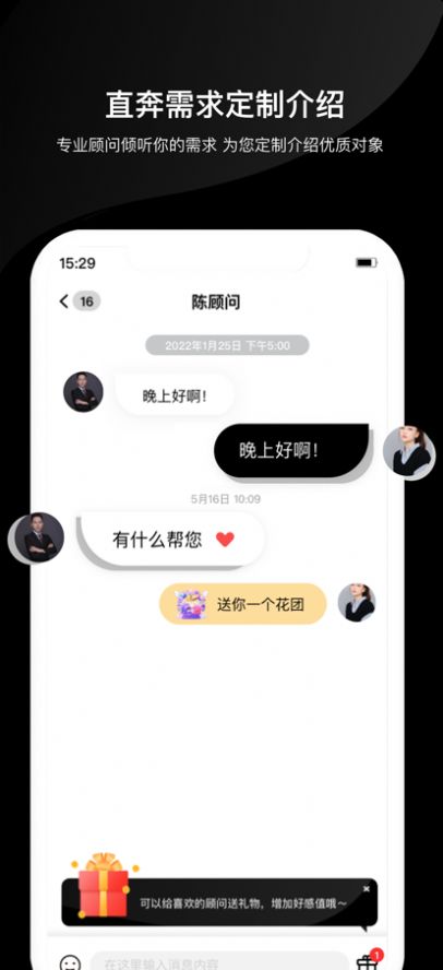 3.专业的恋爱顾问在线进行需求的倾听,帮助用户介绍合适的对象。