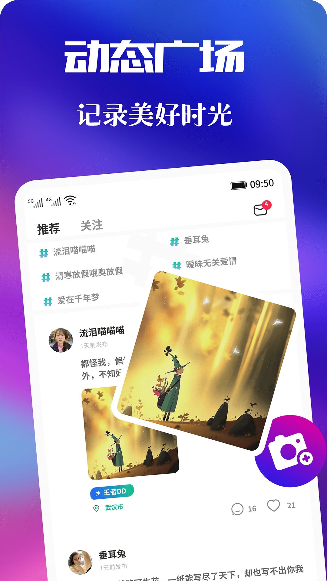 2.动态广场可以随时记录用户的美好时光,分享自己的生活。
