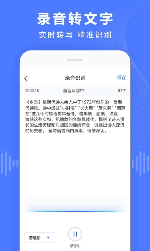 录音转换宝这是一款可以进行录音在线转换的手机工具,用户可以在这里进行录音文字的实时转写,这里所有的识别结果是非常的精准,我们可以在这里进行不同内容的自定义编辑,功能可以说是非常的强大,这款app可以进行音频的在线转换,多种不同的格式,可以自由的选择使用。
