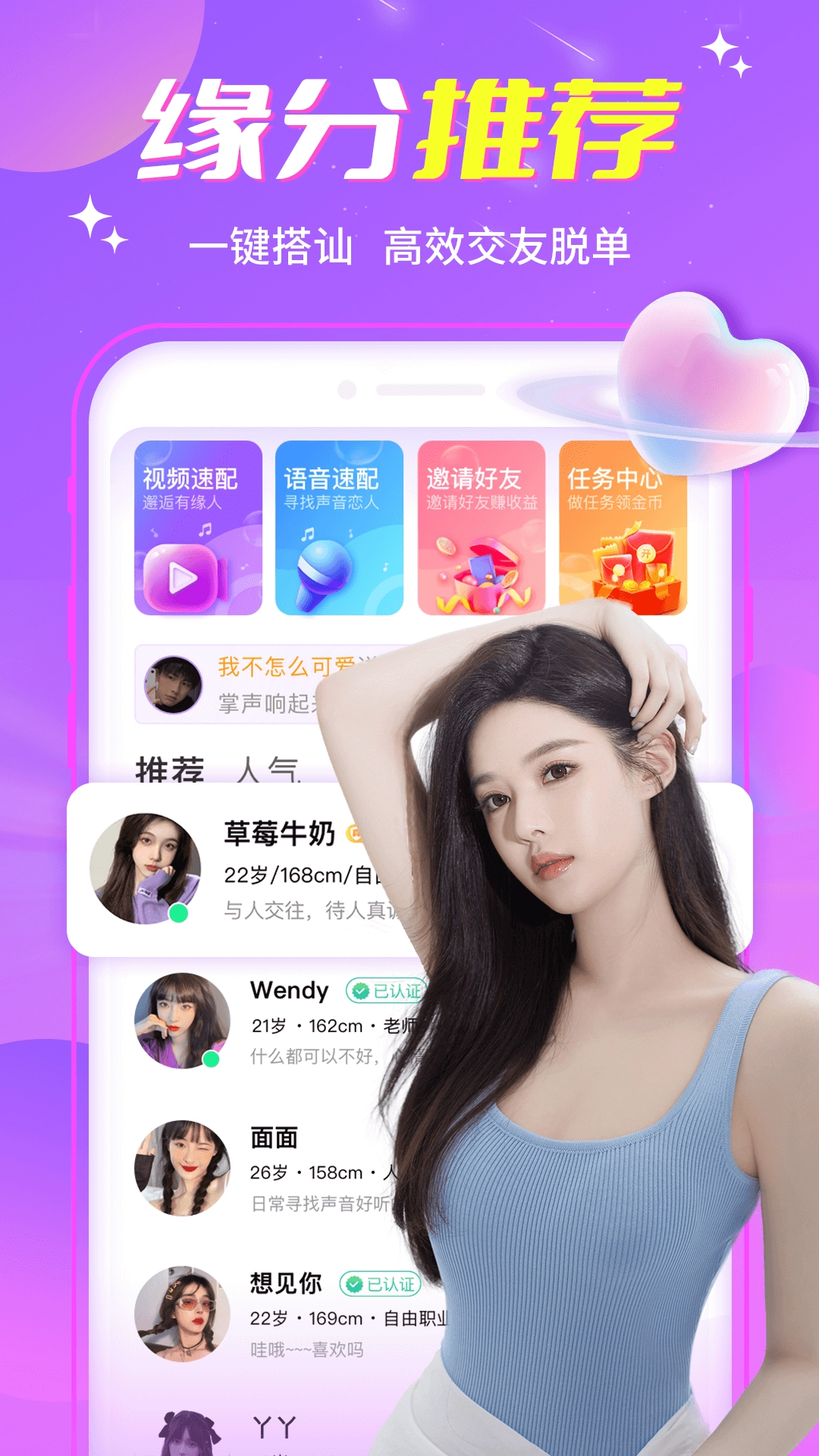 2.一键搭讪,非常高效的交友脱单app,在线进行缘分推荐。