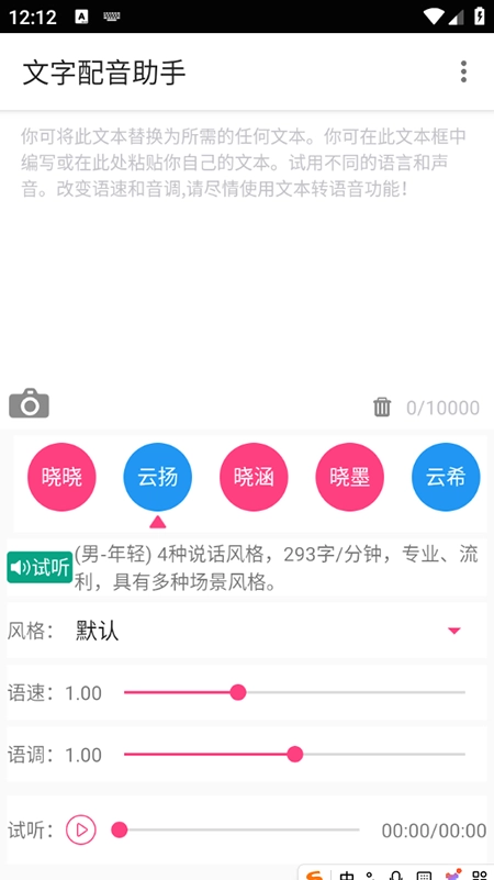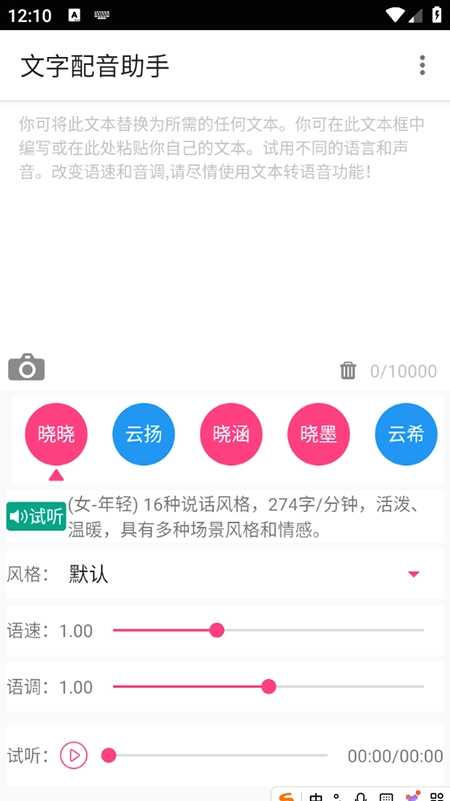 文字配音助手这是一款可以进行在线配音的手机工具,用户可以在这里进行放心的使用,这里拥有详细的新手教程,我们可以在这里根据指引进行操作就可以了,操作十分的简单,我们可以轻松上手,并且在这里还有很多不同的素材可以进行自由的选使用,帮助用户在线提升自己的实力。