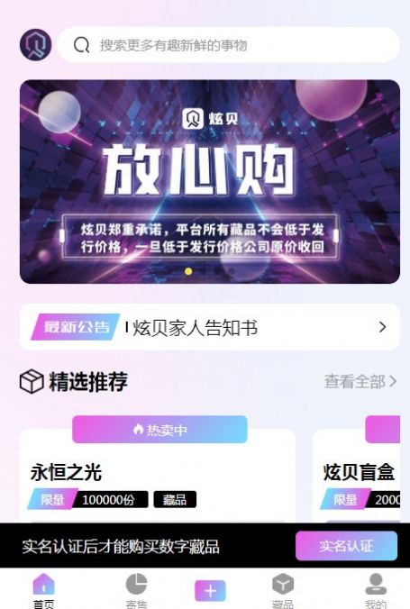 炫贝文创这是一款可以进行数字藏品在线赏析的手机app,这里拥有十分全面的功能。我们可以在这里进行各种不同风格藏品在线交易,这里所有的交易平台都是有保障的,用户可以在这里放心的进行使用,并且我们可以在这里进行自由的收藏,这里拥有专业的鉴赏机构,全天进行在线鉴赏。