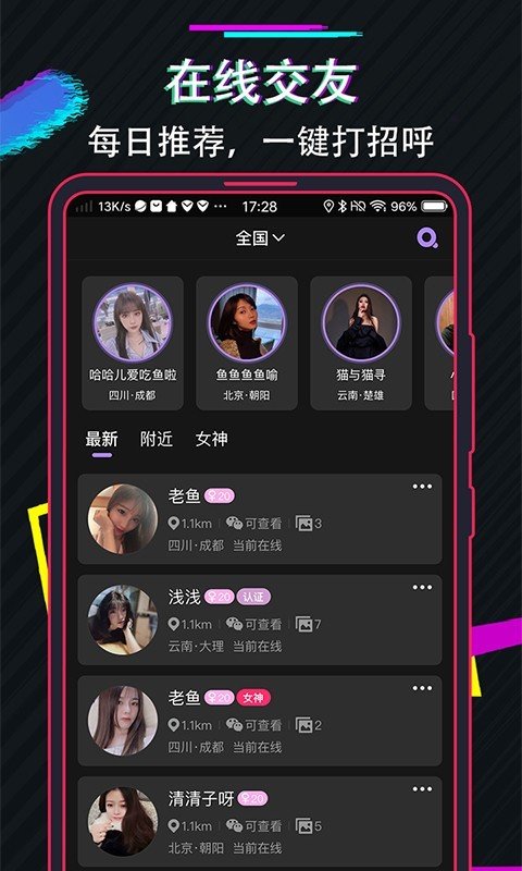 【同城】实时在线,地理定位,实际距离,全方位有趣的社交活动,覆盖所有人群,总有你想要小哥哥、小姐姐一起在聊天室约聊陪玩。