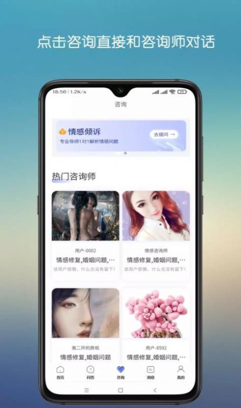 2、这里可以解决婚恋情感、亲子关系、情绪压力等板块的咨询服务,让每位用户的需求都可以满足。