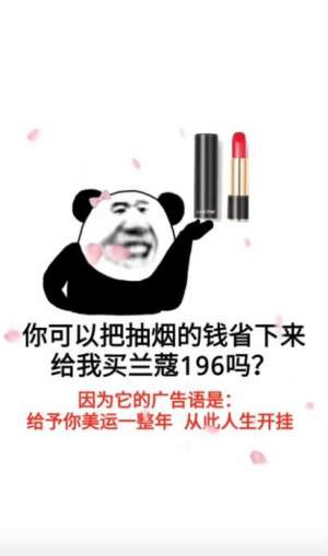 你可以把抽烟的钱省下来给我买兰蔻196表情包是最近抖音上非常火的图片表情包,这款表情包非常受欢迎,考验你们爱情的时刻到了,可以在和男友的互动的时候发给他,快速检测爱你的人是否真的爱你的图片,让一个兰寇196就给你答案。