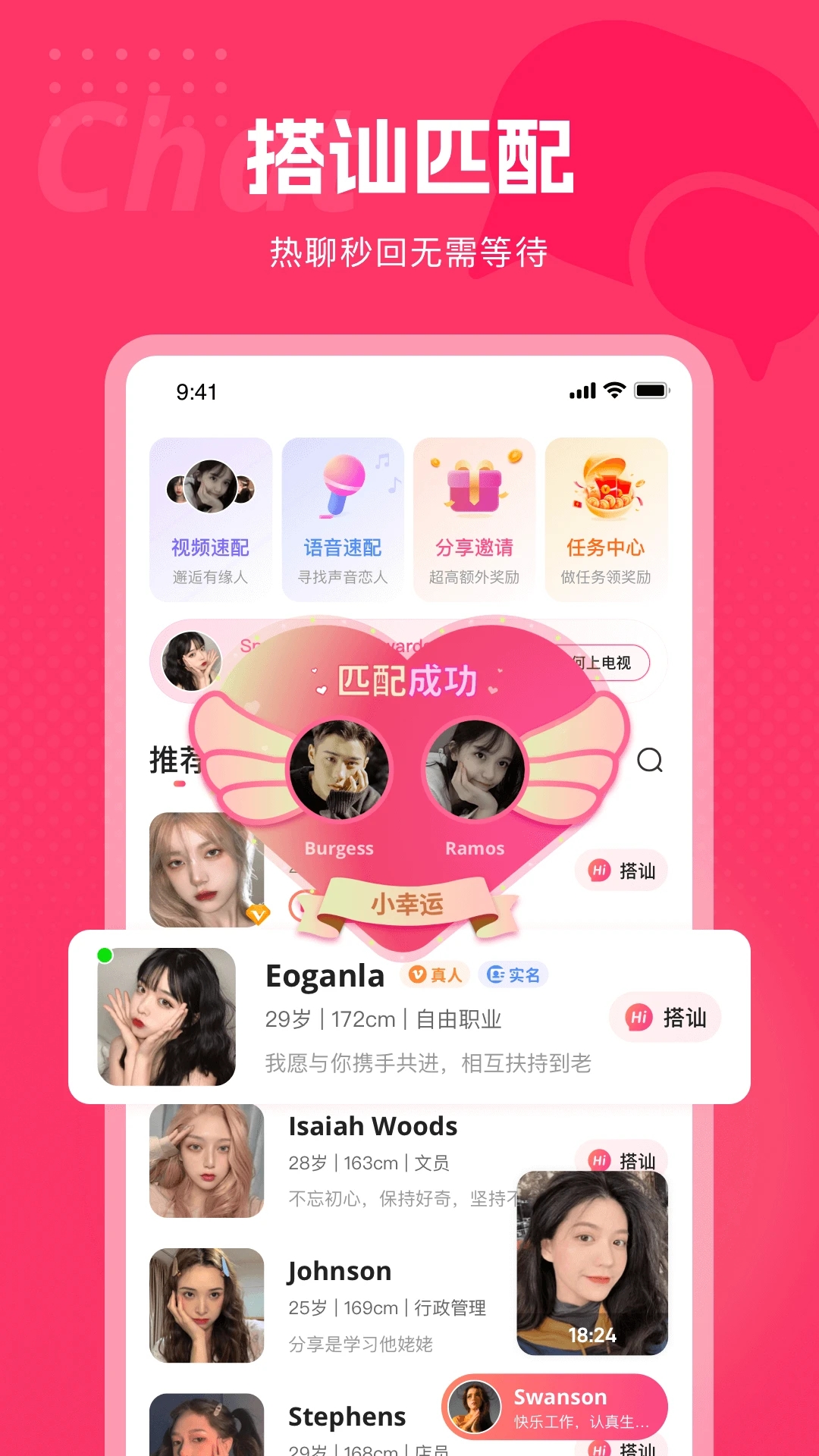 这是一款可以单身在线交友的手机app,用户可以使用这款app进行在线交友,在这里进行约会,实时交流。