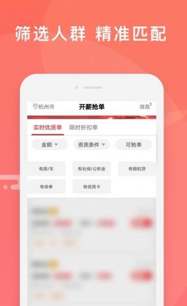 开薪抢单APP是专为金融行业的销售员能够方便获取海量优质客户资源的手机软件,软件是整合行业资源,海量用户从此不用浪费精力筛选,有专业的人工审核订单,保证一手有效客源,能够有效的解决销售员获客困难的问题,提高工作的效率。