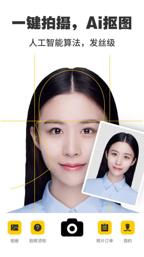 使用应用程序拍照,自动进行智能抠图,一键更改背景颜色,然后选择所需的照片规格;