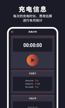 2、充电信息,每次的充电时长,费用估算,进行本月统计,都可以高效去完成;