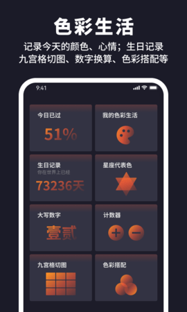 1、色彩生活,记录今天的颜色,心情,生活记录,九宫格切图,换算,色彩搭配等;