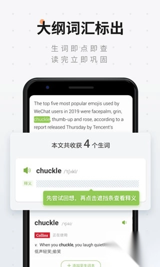 1. 阅读过程中的每个生词都可以即时添加到自己的学习计划中,利用扇贝强大的记忆系统进行学习。