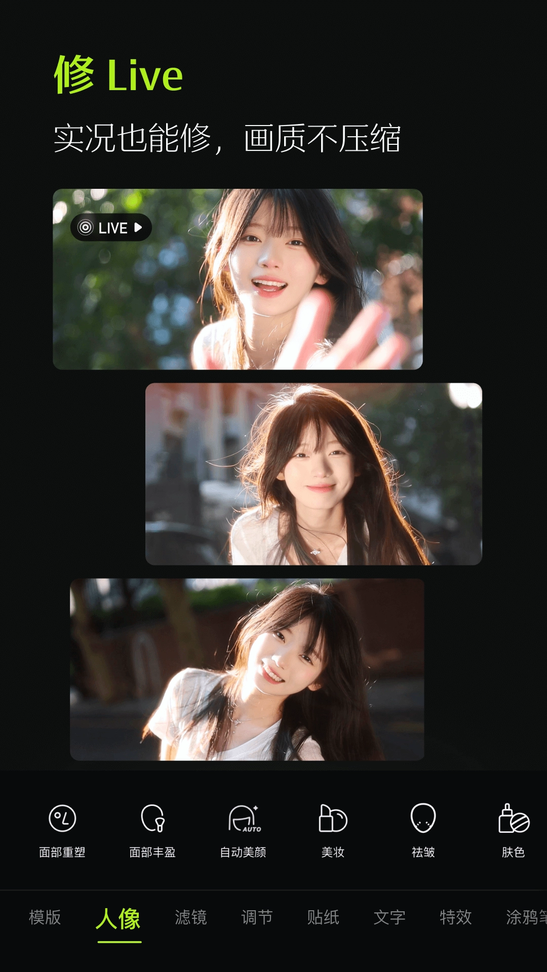 3、为你量身定制美颜特辑,多种实时动态美颜效果!拍照自动美颜,丢掉繁琐的修图工具,每分每秒展现无死角最美的自己!