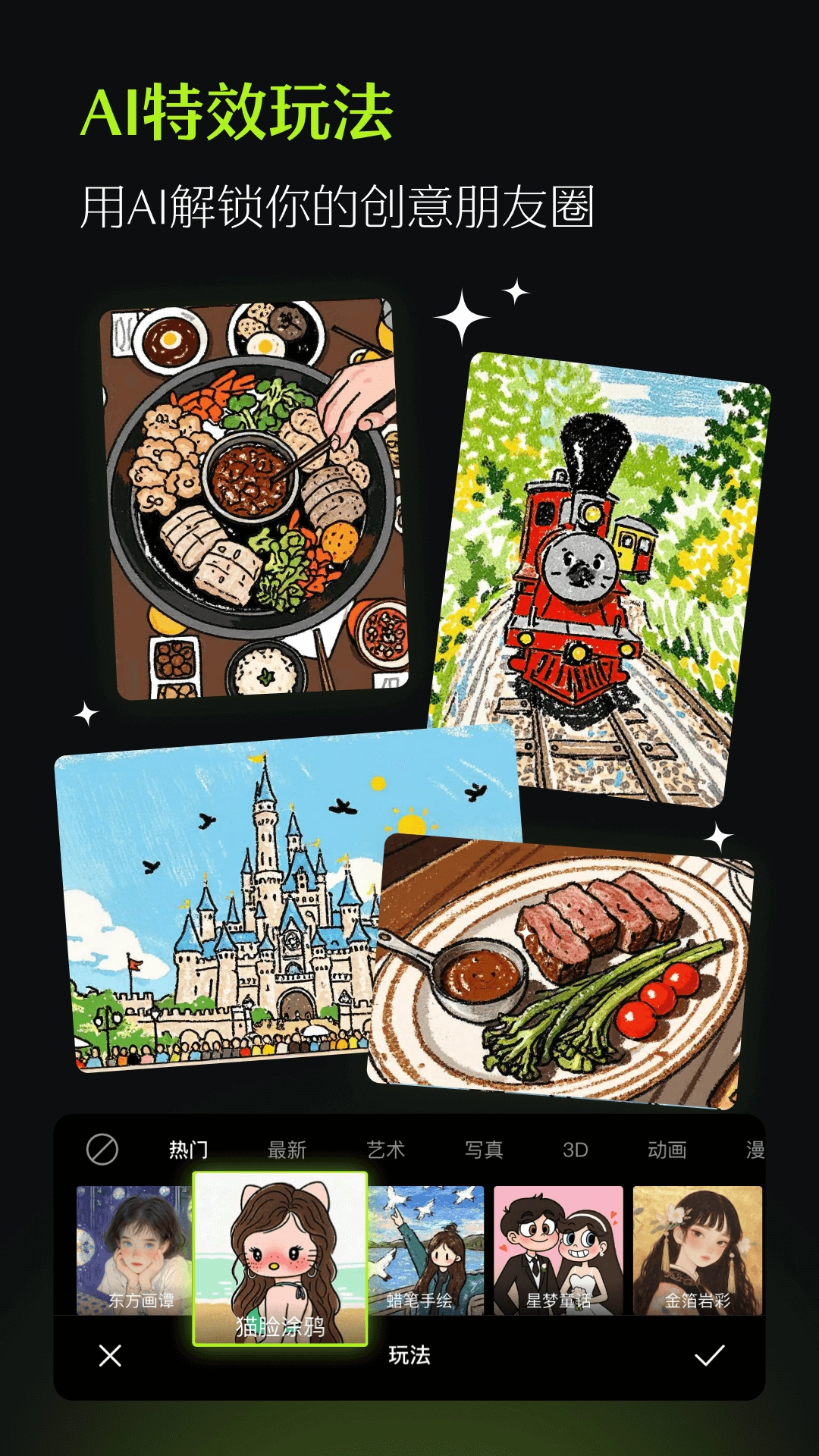 2、非常丰富的滤镜、贴纸、特效等可以免费使用,可以快速制作出高级有质感的照片内容。