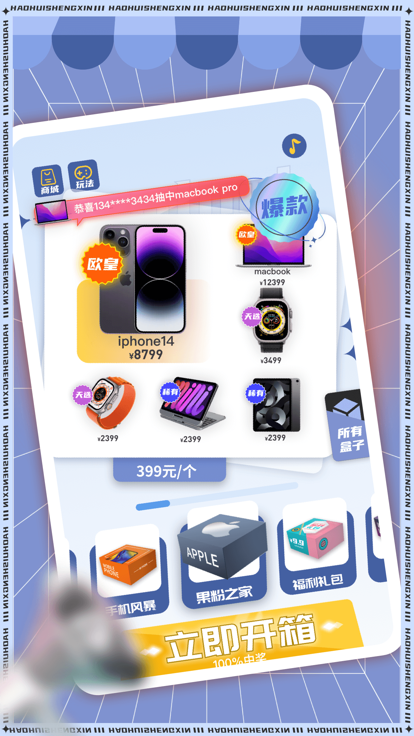 3、有一定几率开出爆款大奖,通过盲盒抽中超值的惊喜豪礼。