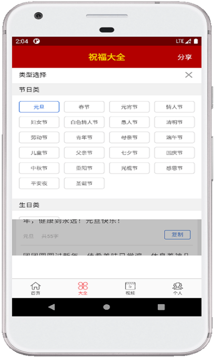 1、详细分类,包括春节、元宵节、中秋节等20多个节日,以及生日、婚礼祝福、同事、领导、恋人收礼分类,支持一键复制,方便分享。