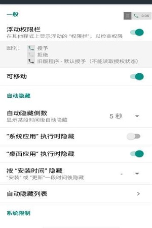 浮动权限栏是一款专门对手机进行管理的软件。有的时候我们根本不知道手机软件打开了什么样的权限,有的软件甚至可以盗取自己手机里面的信息,所以就可以使用这款软件帮助我们更好的去查看手机里的权限是否打开,这样就可以帮助我们更好的保护手机里面的信息。