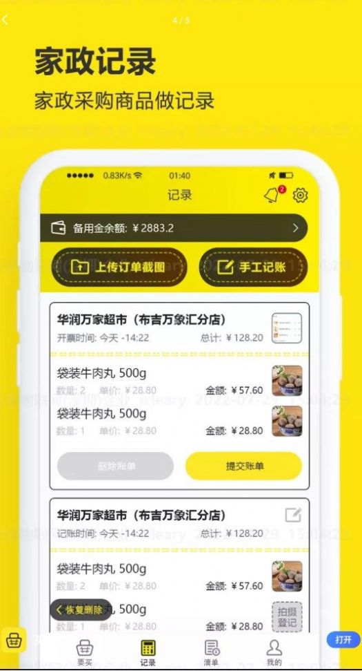 1、快速下载购物单使用。是一款可以满足家政和业主记账需求的软件。