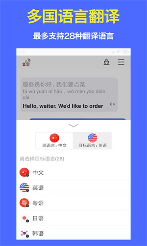 3、还可以帮助使用者点餐或购买商品。应用程序支持多种语言翻译,包括但不限于中文、英文、法文、德文、西班牙文等。