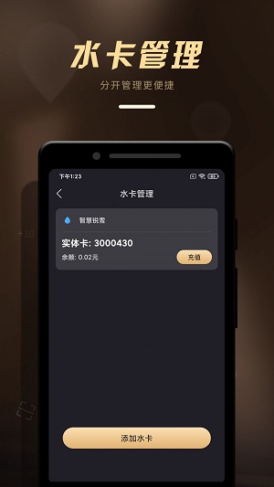 1.在软件中可以对水卡进行管理,可以随时查看余额,余额不足就可以及时充值,及时做好规划。