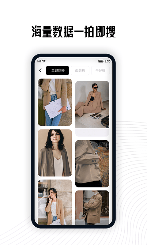 【搜索穿搭】是指用户将一件衣服拍照上传,即可搜索出明星模特穿着相似衣服的搭配范例。
