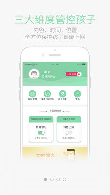 绿网潇湘是一款协助家长轻松管理小孩合理使用网络的应用,实现了用户“零安装”,家长可以一键从内容、时间、位置三个维度对孩子进行管控,产品涵盖基于机器学习和海量网址库的内容过滤引擎,能确保超过99%的不良内容识别准确率。
